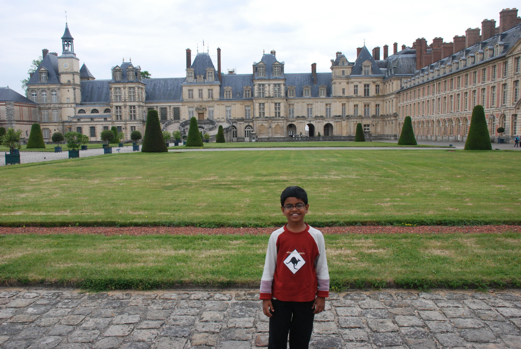 We visited Versailles and Fontainebleau today. Versailles Palace is about 30 km from Paris and is the grandest and the most famous chateau in France. It was built in the 17th century by Louis XIV, who was also known as the Sun King. There was a hunting lodge on this location and when Louis XIV went there for a hunt, he was so enchanted by the place that he decided to build a palace there and move his court. This is an enormous palace and has about 800 rooms and stands in a huge park with its own forest. There are about 78 fountains here and a big canal but the sad fact is that the builders could never manage to get enough water from the river, which was five kilometres away. As a result, all the fountains were shut down and were operated by a man walking ahead whenever the King was taking a stroll. The water scarcity may not have been a matter of grave consequence to the kings as Louis XVI is rumoured to have taken only 40 baths in his lifetime! Bharath was quite taken aback by this statistic. The palace and the grounds are most impressive and the rooms themselves are large and ornate. Not all rooms are open to the public but the most important ones like the King’s Chamber and the Queen’s Chamber are. A very interesting point is that the Queens of that time used to give birth in public to establish the authenticity of the heir’s claim! That must have been quite an ordeal. Marie Antoinette was in this palace when the French Revolution happened but managed to escape from the marauding crowds through a back door.