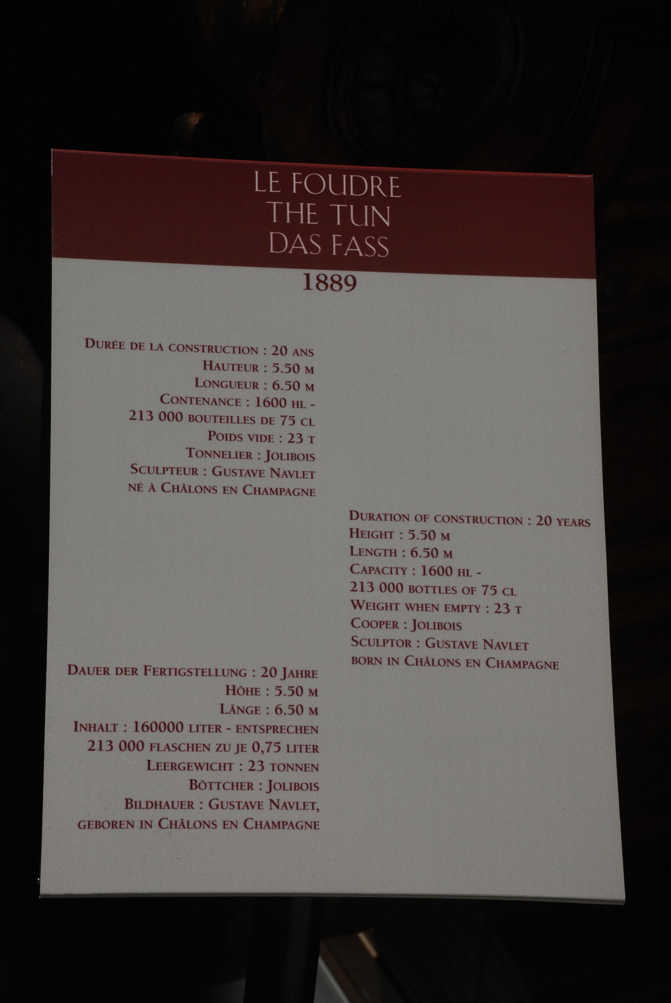 We started the day with a visit to the Mercier champagne house in Epernay. Epernayis at the centre of the champagne trade and has more than 100 km of cellars under its streets! The Mercier cellar is one of the most impressive and they have the largest cellar in the region.Champagneis produced by blending the juice from three varieties of grape that grow in the region – Pinot Noir, Pinot Meunier and Chardonnay. Mericer was started in 1858 by an enterprising young man called Eugene Mercier who was 20 at that time. He seems to have been quite a marketer with an eye for what would sell. In those days, champagne was made in regular sized oak barrels. The taste of champagne would differ from barrel to barrel because of the qualities of the wood. Mercier wanted to sell champagne that would taste the same and so he built one huge oak barrel with a capacity of 213,000 bottles. It took 20 years to build and weighed 23 tonnes when empty. It was finished in 1889 and Mercier took it to Paris to exhibit it in the World Exhibition in 1900. Getting the barrel to Paris was a Herculean task and it took eight days of toil with a team of 24 oxen assisted by 24 horses. It seems they had to buy and demolish some houses on the way for the barrel to pass. Any way, the effort seems to have been worth it as the Mercier barrel won the second price in the show, being upstaged only by the Eiffel Tower. This and similar other moves seem to have won Mercier a special place in the champagne business and success too. He must have been a bold and clever businessman – the investment in the huge barrel brings that out clearly.