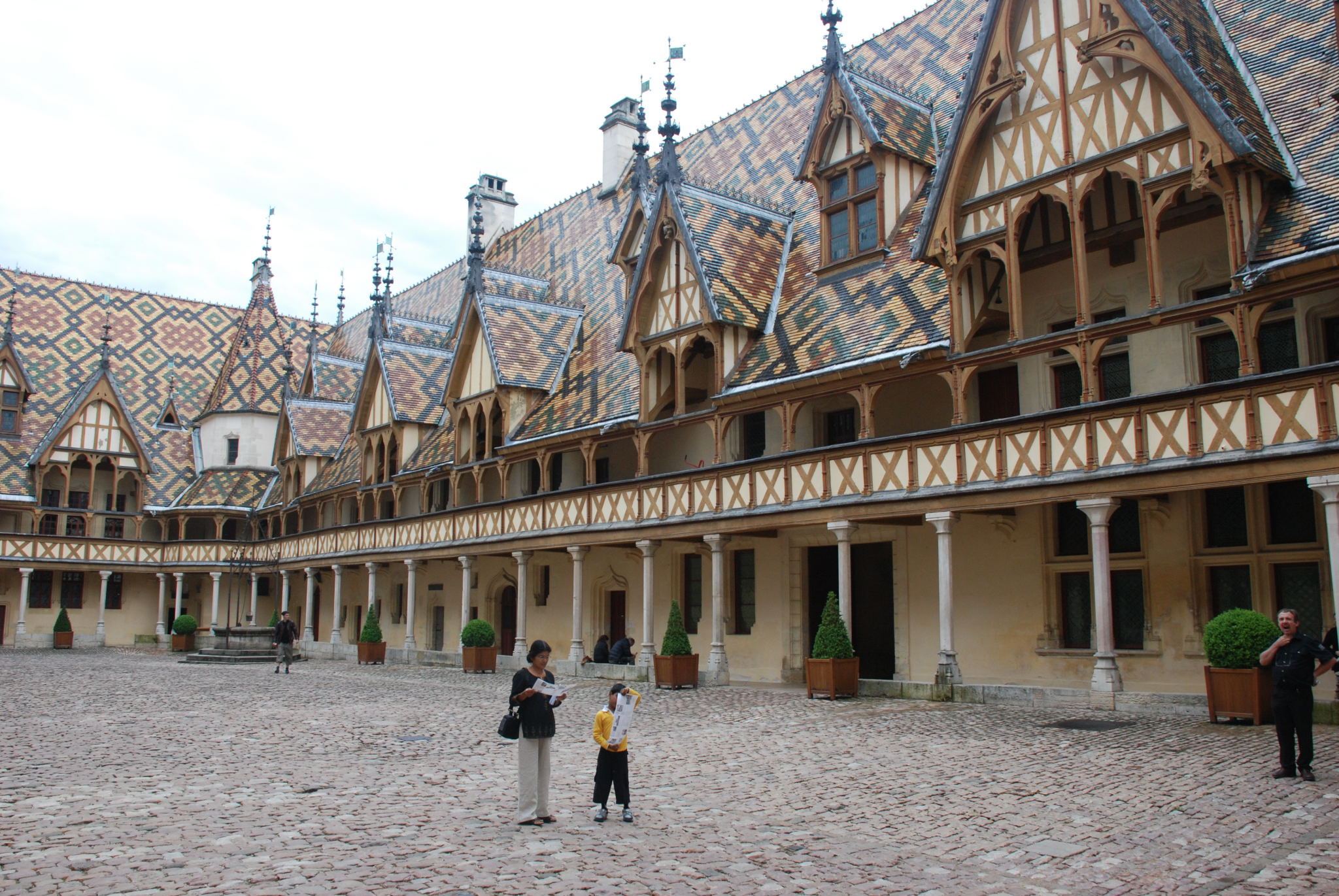 Another long drive took us to Beaune in Burgundy. Burgundy is an important wine region in France, in addition to Bordeaux and Champagne. I can personally vouch for that as I sit here drinking a glass of very fine red wine (the name escapes me). Wine regions generally have very good views and we hope to take in some of that tomorrow. I hope the weather will not be too much of a damper as they are calling for rain tomorrow. It was around four by the time we got to our hotel. This is also a nice, delightful old building right in the heart of town. Beaune is a very small town with a population of 22,000 or so. The main attraction in the town is an old hospital cum poor home – Hotel Dieu which was built in 1443. This was founded by the Chancellor and his wife to help the people who were stricken with famine and poverty after the Hundred Years’ War. The whole concept was quite appealing and the building is very elegant though simple and austere.