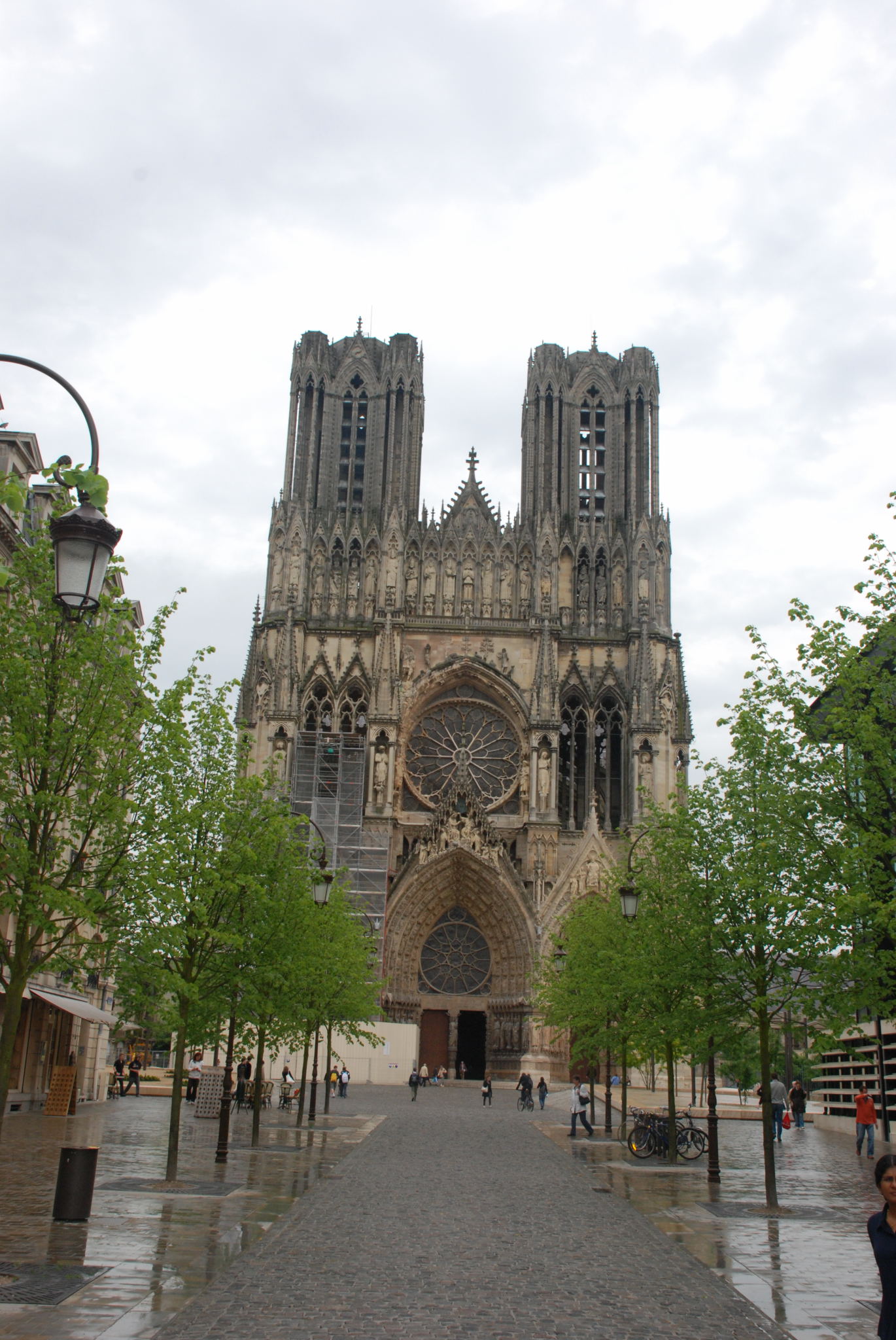 We drove from Beanue to Reims today. In between we dropped in at an entertainment park but that was closed, much to Bharath’s disappointment. It was drizzling for almost all the way and that set us all into a slightly gloomy mood. The hotel was also not very comfortable and so our first impression of Reims was not very favourable! Soon the sun came out and we found the town nice enough to wander through. We visited a church – called Notre Dame Cathedral – which was within walking distance of the hotel. This church was built in the 1200s and has a striking resemblance to the Notre Dame church in Paris. I found this point an interesting one – I think this church was built earlier and may be the one in Paris was set in the style of this one. (I saw that some other towns have also got churches named Notre Dame and when I looked up the meaning of “Notre Dame”, I found that it means “our Lady”). French kings used to have their coronation here and the last one was Charles VII who was crowned in the presence of Joan of Arc. There is also a statue of her in the church.