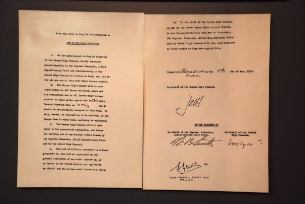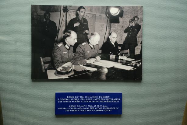 We have couple more hours of sight seeing left and that is it for this tour. The first stop was Musee de la Reddition or the Surrender Museum in Reims. General Eisenhower had his war room in this building (it was a schoolhouse in those days) and it is here that Germany signed its unconditional surrender in the Second World War on May 7, 1945. It was signed by General Alfred Jodl on behalf of the Germans. The full text of the document is available for view and is typical of field originated documents that do not get to lawyers, it is short, crisp and to the point. One can only imagine the feelings that must have gone through the minds of all concerned when such a horrible war came to an end. Unfortunately, our memories seem short and we move on from conflict to the other. There were some newspaper clippings as well – from the papers that were published the next day. Interestingly, another surrender document was signed in Berlin after two days, on Stalin’s insistence.