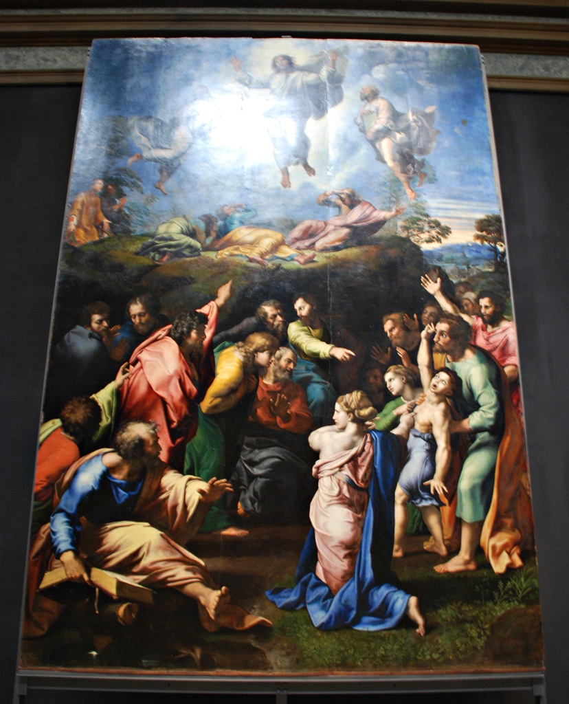 We had made a booking for Vatican Museums for 9 am, as I was afraid of the possibility of a long queue. The advance booking saved us and we got in rather quickly. As you walked into the museum, the first thing that hit you was the vastness of the place. There was no way one could do justice to the place in a couple of days, let alone the couple of hours we had allotted for it. There are many, many art pieces here from various masters that Vatican acquired over the years. The lighting was not conducive to good photography and in Sistine Chapel, photography was not allowed at all.  Raphael had done a lot of work in Vatican and his last painting “The Transfiguration” can be seen here. Raphael was very a prolific artist and had produced many works and achieved great fame, even if he lived only for a short time (he died when he was thirty seven). In fact, in his sarcophagus, it is inscribed “Here lies that famous Raphael by whom Nature feared to be conquered while he lived, and when he was dying, feared herself to die.”
