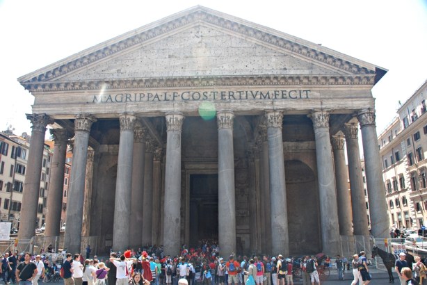 It is the largest dome in Rome and has a diameter of 43.5 metres at the base, which then reduces to about 9 metres at the top. It is said that Michelangelo visited the Pantheon many times when he was rebuilding the dome at St. Peter’s Basilica and he was so impressed by the dome at Pantheon that he built the dome of St. Peter’s to be smaller than the one at Pantheon. The dome is built by using heavier materials at the bottom and thinner materials at the top – the base is about 6 metres thick and then falls to less than 2 metres at the top. The walls are made with handcut bricks and the columns are made of marble imported from Egypt.