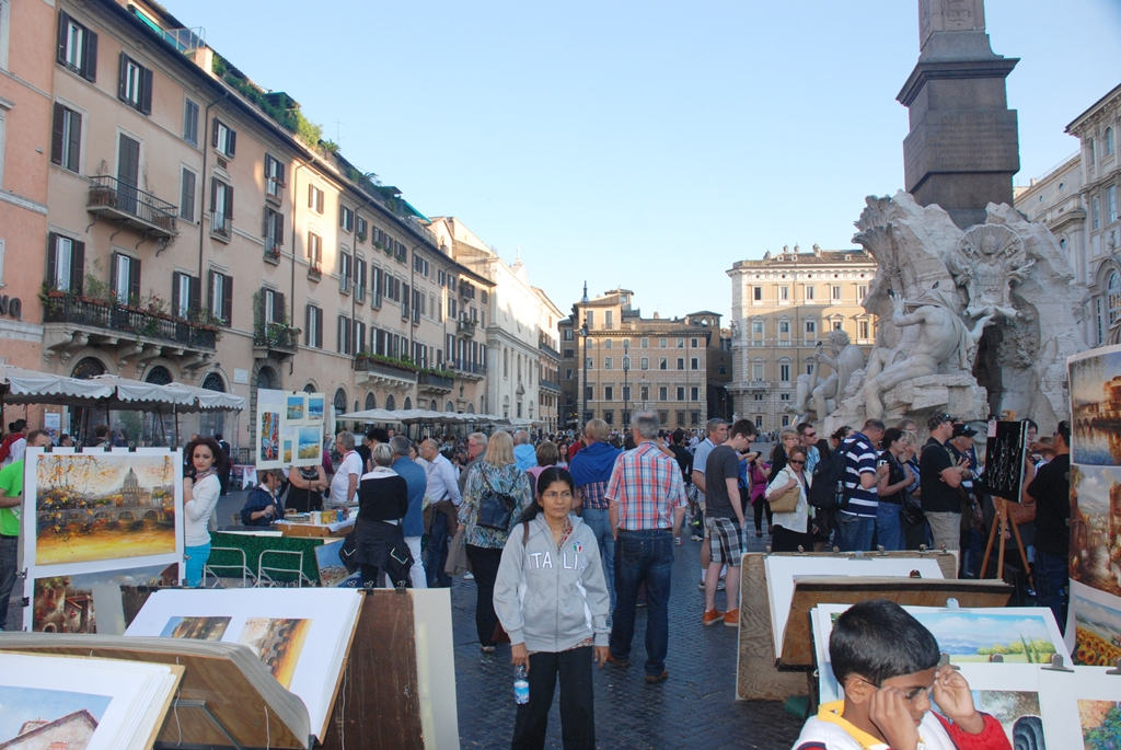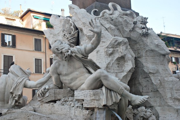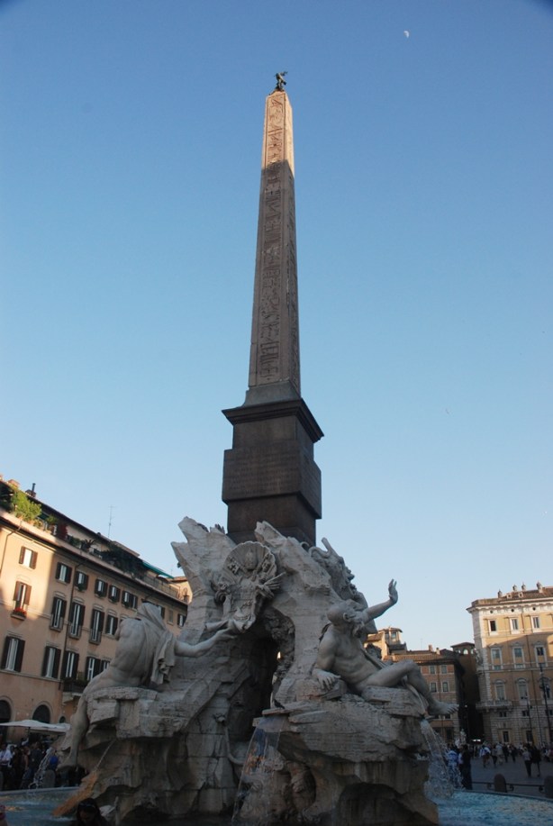 The last stop of the day was Piazza Navona, another one of those delightful public spaces. This was a circus (stadium) before and was converted to a square in the 15th century. The most important feature of Piazza Navona is the Fountain of the Four Rivers (Fontana dei Quattro Fiumi) by Bernini. The fountain has a basin as a base with a rock on it and an Egyptian obelisk that rises from the rock. There are also four river gods depicted on four sides of the rock. These rivers were supposed to represent four continents to which the Roman Catholic Church had spread – Ganges representing Asia, Nile representing Africa, Danube representing Europe and Rio de la Plata representing America.