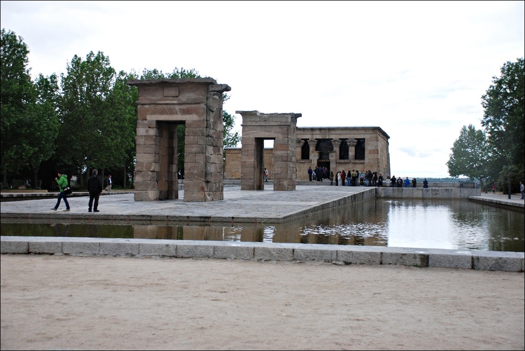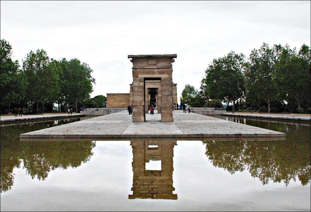From the palace, we walked to a monument, which one can arguably say, is quite out of place! This is Templo de Debod, which is an ancient Egyptian temple that dates back to the 4th century BC. When the Aswan Dam was being built on river Nile, many temples were under the threat of being submerged in the waters and this was one such. The Egyptian government donated this temple to Spain, in gratitude for the help offered by Spain in saving the temples of Abu Simbel. The temple was taken apart block by block and rebuilt in Spain in 1968. It stands on a beautiful park looks very beautiful, surrounded by water. There are two gateways and then the temple itself. There were Egyptian hieroglyphs on the inside walls of the temples and it led to a sanctum sanctorum. The light was very poor and so I could not get a good photograph. There was not much explanation provided and so one could not get much information on the temple. Overall, it was good to see the temple and I am sure that sunsets would be great here and when the light is right, a great photo location!