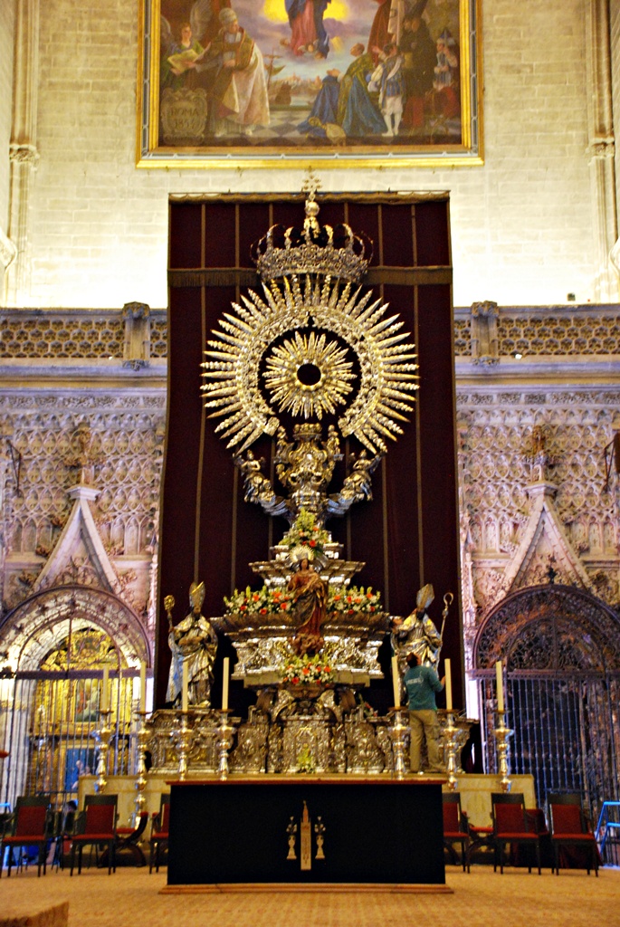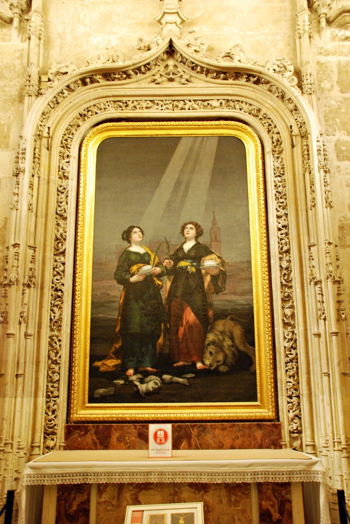 There are a good many chapels inside the Cathedral and many are very ornate. The one that attracted me the most was the Chapel of Saints Justa and Rufina. They were sisters who lived in Seville in the late Third Century and were ardent Christian believers. They refused to convert to pagan faith and the (pagan) authorities who ruled Seville at that time had the sisters tortured and killed them finally. During one of the pagan festivals, the pagans destroyed the utensils that the sisters had made and in retaliation, they broke a statue of Venus. According to legend, during their imprisonment, one of the sisters (Rufina) was thrown to the lions but the lions refused to attack her and licked her feet. These two incidents are represented in a painting placed in the altar of the chapel dedicated to them. I was wondering whether they would have thought that their story would be remembered 1200 years later and retold when a church was built. Supposedly, the resistance of the sisters represented the resistance of Seville. The La Giralda is also shown in the background in the picture.