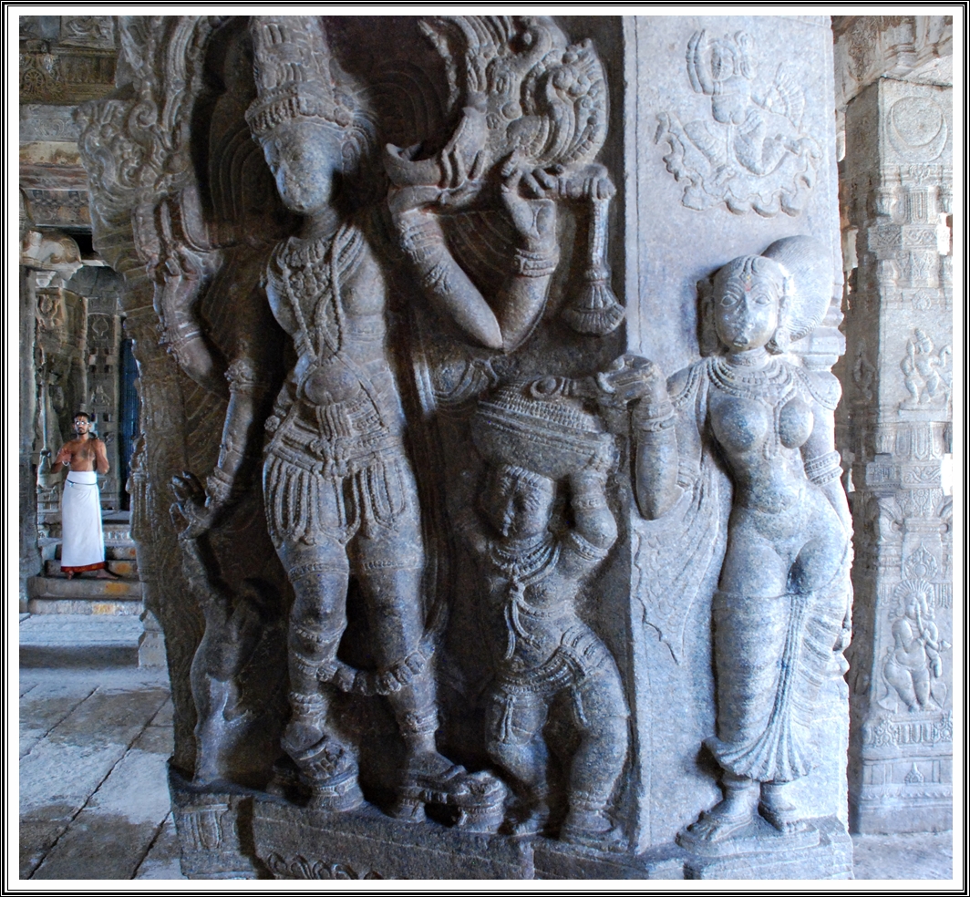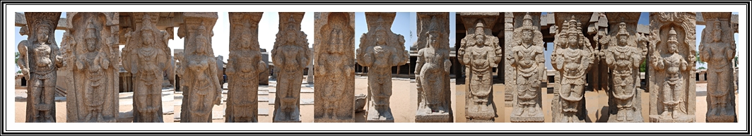 The theme of the kalyana mantapa is the wedding of Shiva and Parvati and the images of all the main guests that attended have been carved on pillars that form a rough square, in the centre. The guests depicted are (left to right in image below): Viswamitra, Eeswara (Shiva), Shiva in wedding attire, Maina Devi (Parvathi’s mother), Parvatharaj (Parvathi’s father), Devendra, Agni, Yaman, Vasishta, Varun, Bruhaspathi, Dattatreya, Vishnu, Vayu and Kubera. The guide also told me that some of these people did not particularly enjoy the company of some others in attendance (for instance, Viswamithra and Vasishta) and hence, has been placed opposite to each other in the square. It was curious that the sculptor did not feel a need to bring in Parvathi into this mix.