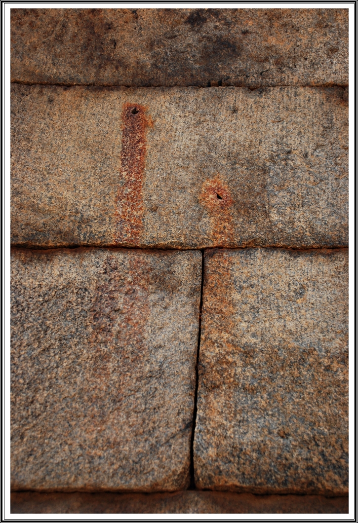 Now comes the most interesting part of the Lepakshi legend. It seems that some vested interests convinced the then king that Virupanna was squandering the resources of the royal treasury and the king, angered by this, ordered for him to be blinded. Virupanna was standing at the site of the kalyana mantapa when he heard this news and he himself plucked out his eyeballs and threw them on to a nearby wall. On that wall, there are marks with small holes and long stains, to be seen. Supposedly, the eyeballs pierced the stone and the stains were caused by blood. The guide was adamant that recent tests have shown that it is indeed blood and all efforts by the British to wash it away with acid had proven futile.