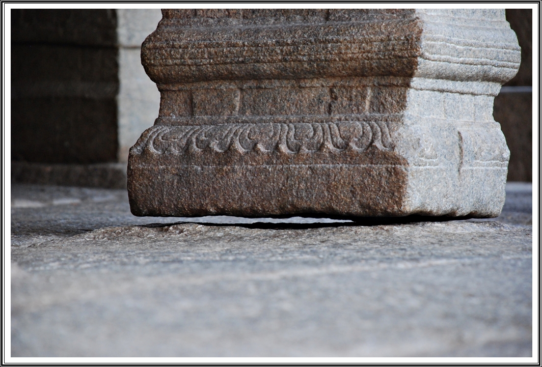 All the pillars in the natya mantapa have beautiful carvings and the roof in the central space has a beautiful flower with 100 petals. Of the 70 pillars, one pillar does not rest on the ground and is a “hanging pillar”. Supposedly, a British engineer tried to find the secret of the hanging pillar and damaged it a bit in the process with the result that one corner touches the ground now. Fantastic structural engineering from the days gone by!