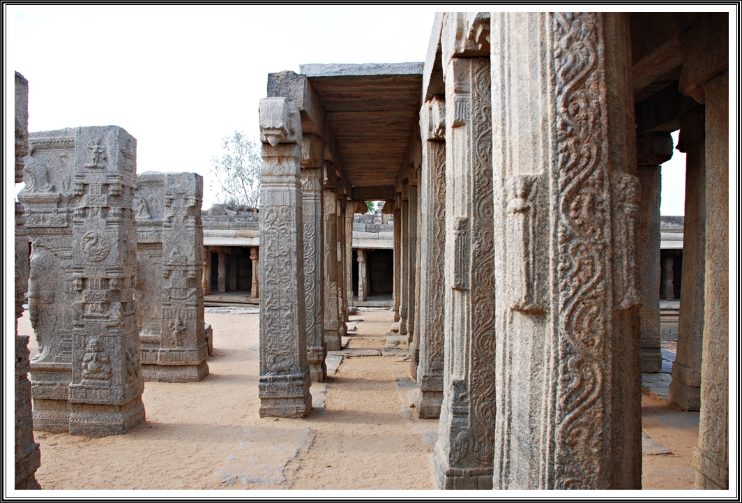 Just beyond the Ganesh is the site of the unfinished kalyana mantapa (marriage hall). There are many pillars strewn about the place with fantastic carvings.