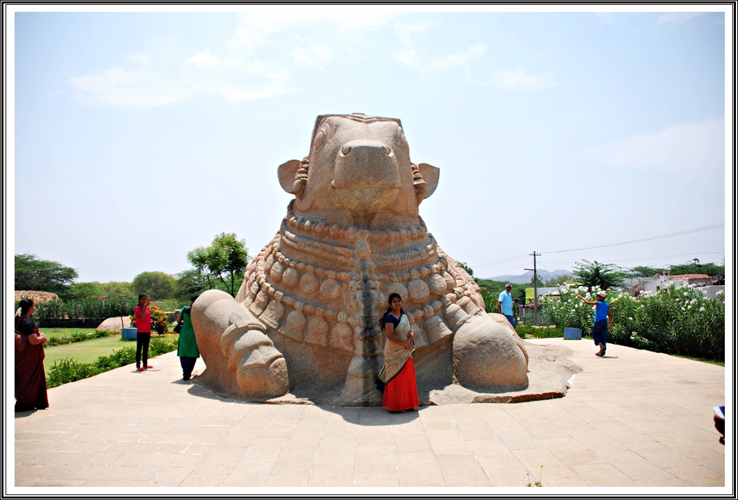 Within a kilometer or so of the temple is a huge bull (Nandi) carved out of a monolithic rock. It is 15 feet tall and 27 feet in length and beautifully carved. It faces in the direction of the seven headed snake with the sivalinga. I am not sure when it was made; to me, it looked a bit more recent than the temple.