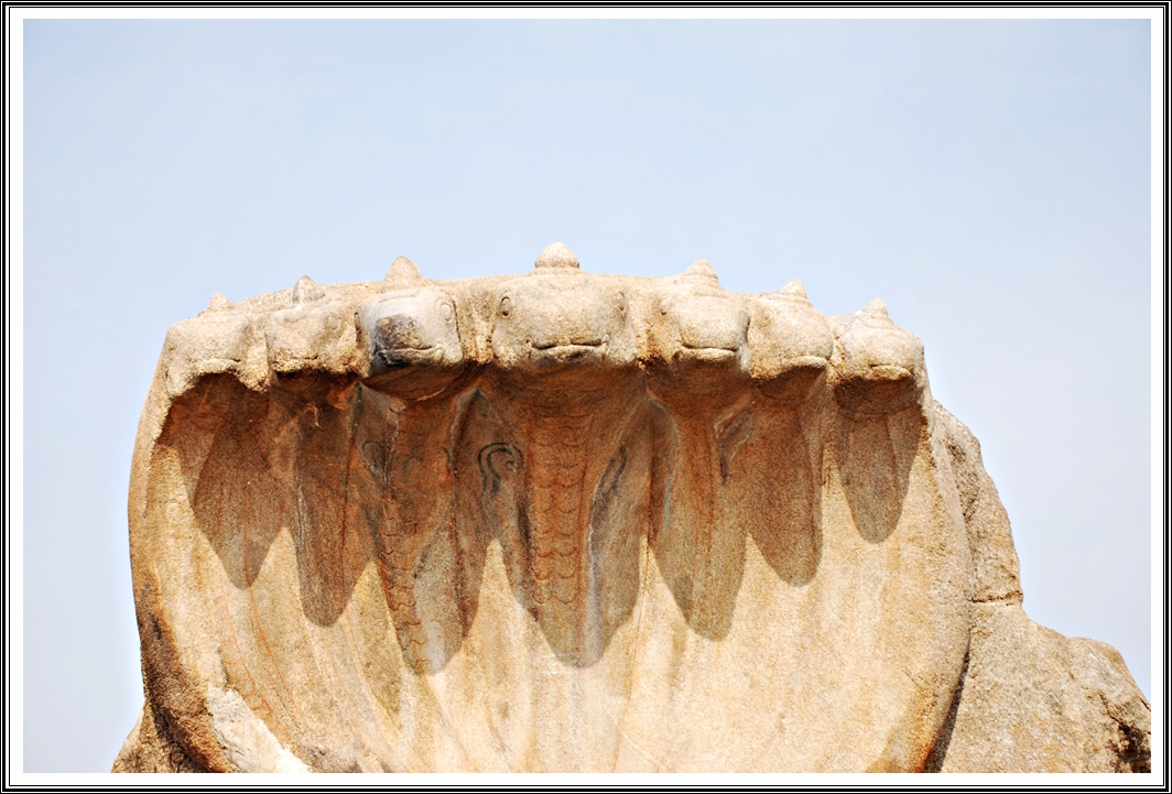 Outside and behind the sanctum sanctorum is a huge statue of a seven headed snake protecting a sivalinga. The serpent faces the room that was used as a kitchen by the mother of the sculptor. The story goes that one day when the sculptor came for lunch, it was not ready as his mother had been engaged in some poojas, as it was an auspicious day. The mother asked her son to wait while she prepared food. The sculptor did not want to sit idle and this statue was what he made while he waited for lunch – must have been some superman sculptor to finish such a huge statue in such a short time. In any case, his mother came out, saw the statue and was very impressed by the beauty of it. However, her “evil eye” caused the statue to have two vertical cracks on the coils of the snake and the sculptor was quite saddened by it saying no one would ever notice his work. However, she advised him to put a sivalinga in between the coils of the snake and said people would then pray to it and supposedly that is the story behind this beautiful work. In any case, it is a very impressive statue and is one of the most commonly reproduced images of Lepakshi.