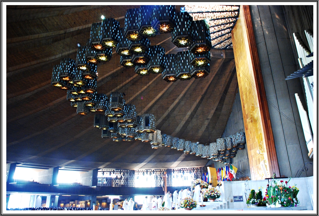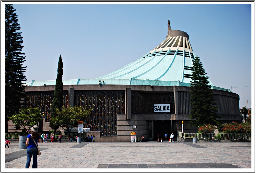 Mexico City was essentially a large lake that the Spanish dried out and they constructed buildings on the lake bed. However, they did not fully appreciate the issue of building on soil which is not very firm and so many of the buildings from the Spanish colonial era are sinking. The original Basilica was also sinking and a new and far more modern version was built between 1974 and 1976 with stronger foundations. This building is quite interesting and does not resemble a typical church and looks from the outside, like a museum. All the glass work on the building has been made by Indians and the light inside is very strange and the overall feel was very, very different from the other churches I have been to.