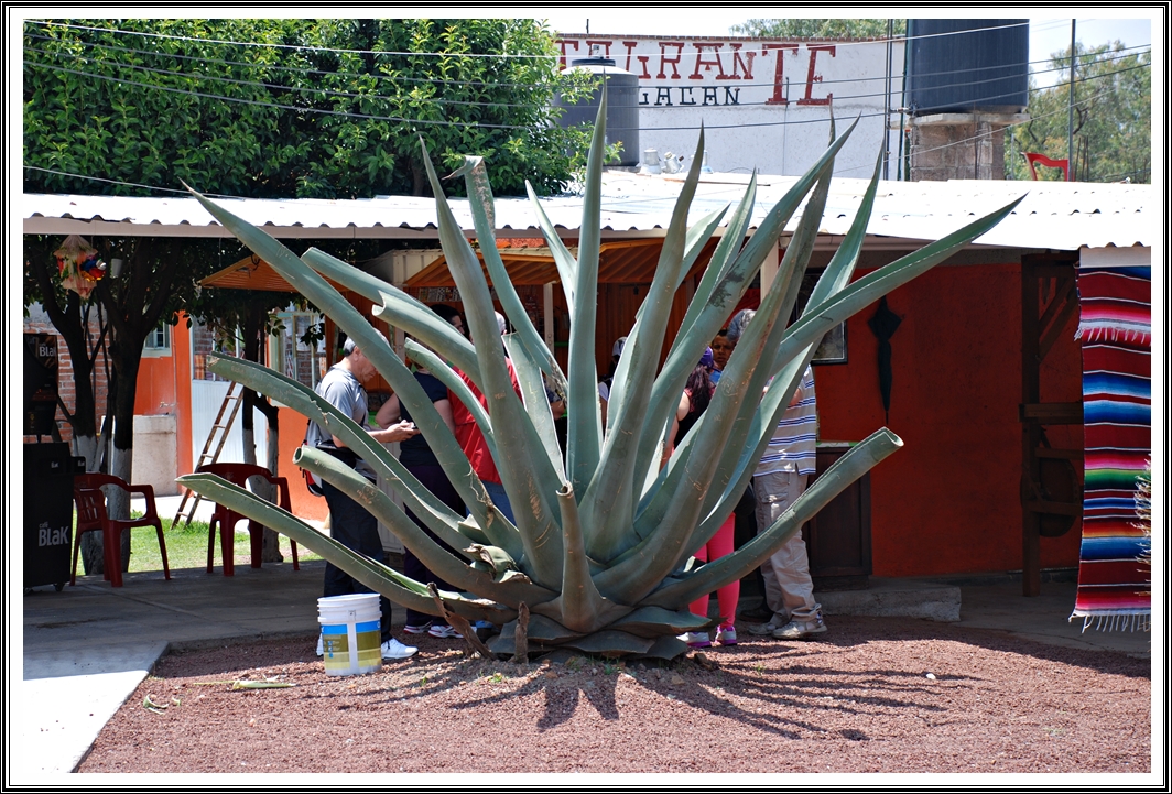 Before we reached the pyramids themselves, there was the customary stop at some tourist traps. There, we were shown how important the Maguey variety of cactus was, to the indigenous people. A short grows from the centre of the cactus and when this is cut out, a bowl shaped area of formed and every day, each cactus produces around 4 litres of juice for six months in a year. This juice, when fermented, becomes an alcoholic drink. I tasted it and found it quite like toddy, which we get from coconut trees. At the tips of the leaves of the cactus, you can find a very sharp and sturdy black coloured needle and the needled has a kind of string attached to it and can be used to sew clothes together. From the inside of the leaf, a very thin layer can be removed and it can be used like paper or papyrus. Overall, the Maguey cactus is a very useful tree and almost all of it can be used, much like the coconut tree.