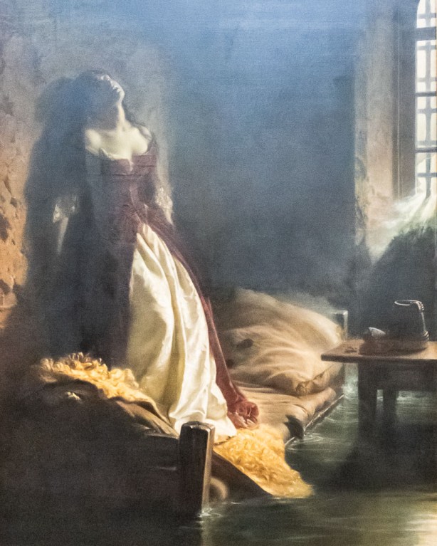 This piece by Konstantin Flavitsky is titled Princess Tarakanova and is based on the story of a young woman named Tarakanova from Italy, who claimed a right to the Russian throne. Catherine II lured her to Russia and imprisoned her in Petropavlovskaya fortress in a cell that was known to flood every time the waters in the nearby river rose. The painting shows a desperate Tarakanova standing up on her cot as the flood waters have reached almost up to the bed. There is no evidence of whether Tarakanova was indeed killed like this but the painting caused a lot of public outcry and Ivanov was later forced to announce that he had made up the subject from a novel.