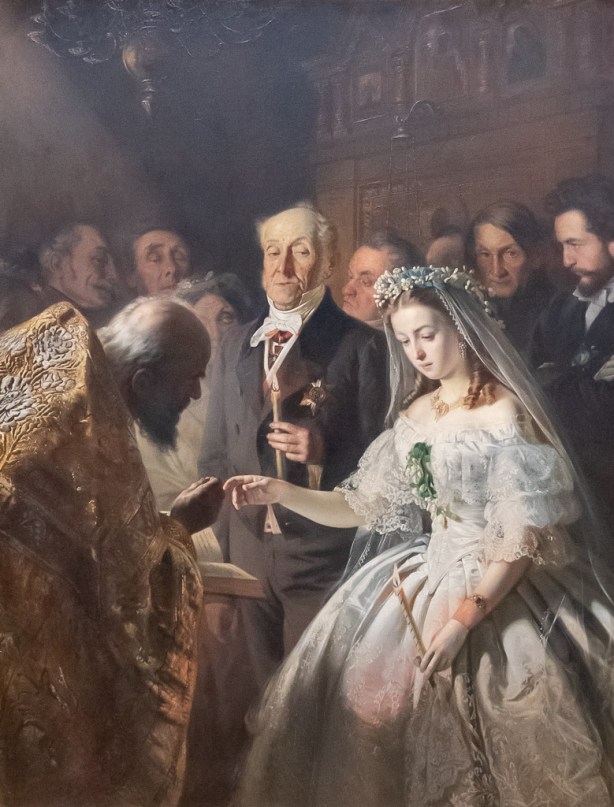 I liked this painting (The Unequal Marriage by Vasily Pukirev) quite a lot and it seems it was received with a lot of enthusiasm when it was painted as it did not stick to conventional subjects used till then, but instead chose to show a social issue that was common at that time – old, rich men marrying young women who are unwilling, but are forced into the marriage. A young man, supposedly, the girl’s lover, looks on from the back.