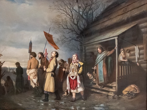 Painting titled “Easter Procession in a Village” by VG Perov. I quote from the description provided by the museum: “In the early 1860s, Perov created a series of anticlerical paintings. Its main theme was the clergy that forgot their duty. A bored and drunken procession carrying icons and gonfalons is passing by the viewer. The peasants with half-closed eyes are wading towards a precipice as if they were blind. Their leader, a drunken priest, who has crushed an Easter egg underfoot, has abandoned them. Not far from him we see a woman holding an icon whose image is effaced. Farther off there is a poor man carrying an icon upside down. But the All-Seeing eye on the gonfalon is there as a reminder that these people won’t escape the Supreme Judgment. The dull landscape, dissonant movements of the participants in the procession and bleak dawn emphasise the ugliness of the whole scene. The painting was removed from an exhibition of the Society for the Encouragement of Artists in St Petersburg on grounds of it being an “immoral” work. Its reproduction in the press was banned, and P.M. Tretyakov was advised not to show it to visitors.”