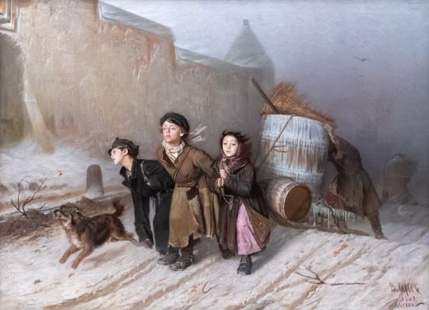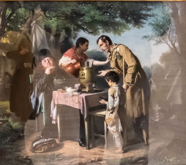 Yet another work by Perov that speaks about the social issues of the time: “Tea-party at Mytishchi near Moscow”. I quote from the description provided by the museum: “Ordinary on the face of it, the scene of tea drinking under the shade of a tree is transformed by Perov into an accusatory picture that deals with an acute social issue. The table turned cornerwise to the viewer with a samovar on it halves the small canvas, which is almost square-sized. The world of the painting’s characters also breaks into two parts: on one side, we see a fat, well-fed priest, on the other side – a poor old man and a boy. The impression of social drama is reinforced by the Order of the Hero of the Crimean War on the old man’s chest. At the same time, the idyllic background landscape and the circular rhythm of the painting’s composition embody the idea that justice and harmony lost should be restored in the world.”