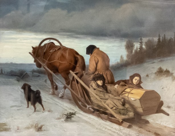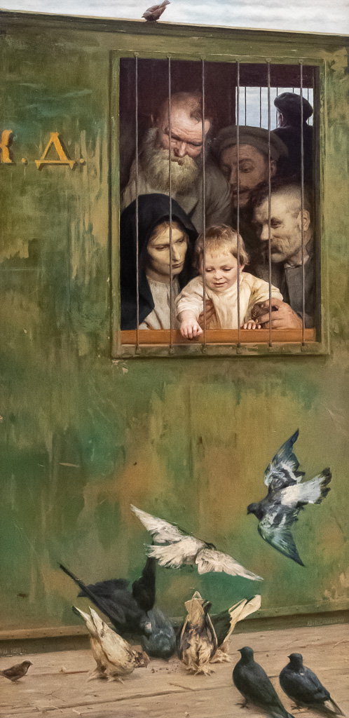 This work titled “There is Life Everywhere” by Nikolai Yaroshenko was yet another image that I liked a lot. I quote from the description provided by the museum: “ The topic of social contradictions was one of the most important for Yaroshenko. This painting was inspired by Leo Tolstoy’s story What Men Live By. The artist originally planned to title his work as Where There Is Love, There Is God. Prisoners have huddled up together at the window of a convict car to feed pigeons. The painting’s idea was to show humanity maintained in inhuman conditions. The central group reminds the Holy Family. Like many other Wanderers, Yaroshenko used parallels with the Gospel to enhance the social resonance of his canvas. “This speaks so much to the heart,” said Leo Tolstoy about this painting.”