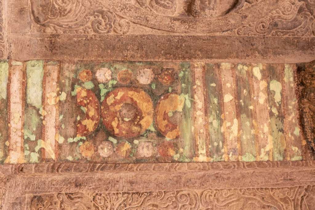 It seems that most of the sculptures were painted in the olden times but almost all of the colour has been lost. They must have used vegetable dyes and this must be why the colours were lost over time. In cave 3, we can see some notches on the floor and the guide said this was the palette for mixing the paint but I am not too sure. Currently you can see some colour only on one small section of the ceiling in Cave-3.