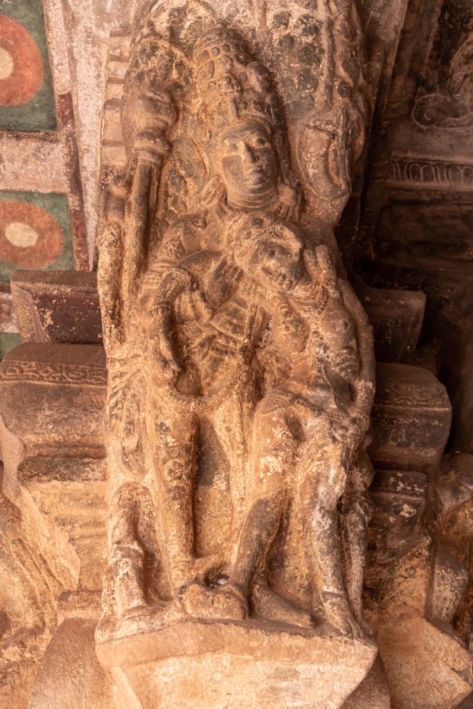 Statue of Ardhanaareeshwara with Sage Bhrigu (the skeleton like figure) and Nandi shown on the side of Shiva and a female consort on the side of Parvati. The guide told me that Bhrigu had become skeleton like after he was cursed by Parvati but that was not how I remembered the story and internet too confirmed that it was Lakshmi who cursed Bhrigu to be doomed to poverty. According to the puranas, Bhrigu had set out to find who among the three gods – Brahma, Shiva and Vishnu – was the greatest and when he arrived at Kailasa, Nandi did not let him enter as Shiva was busy making love to Parvati at that time. The enraged sage cursed Shiva that he would only be worshipped as a Lingam (phallus) along with a Yoni to depict Parvati. Perhaps, it is this story that the sculptor wanted to convey through this work. This story about Bhrigu is quite interesting and once again points to the richness of the Puranas which often did not follow any hierarchy with Sages being superior to Gods themselves, at times, while the Sages spent their lives worshipping those Gods. They provide so many such sly entry points to paths that lead to the questions on what is supposedly the main theme.