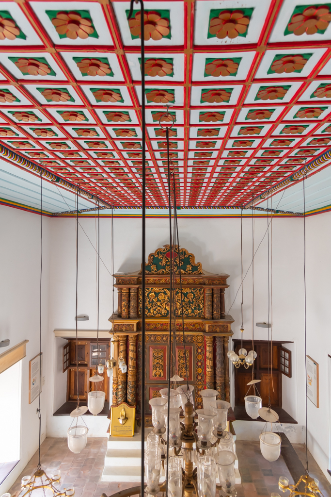 The main area consists of a hall where there is a raised wooden platform called the Bemah or Tevah. This is a structure in the middle of the room, and it faces the Ark, which is a wooden structure along the wall that is closest to Jerusalem. The books of Torah were stored inside the Ark. The original Ark (from 1100 AD) used to be there at this synagogue, and it has since been removed and taken to a museum in Israel. A replacement Ark is in place now. The ceiling is from 1616 and is still surviving. It looks very solid with nice workmanship. The synagogue is not used for worship and the last service was conducted in 1958. Jews from Kerala left in large numbers after 1950, after the formation of the state of Israel and it seems that for prayers to take part in a synagogue at least 10 male members should be available and since the numbers dropped because of the migration, the synagogue ceased to be in active service.