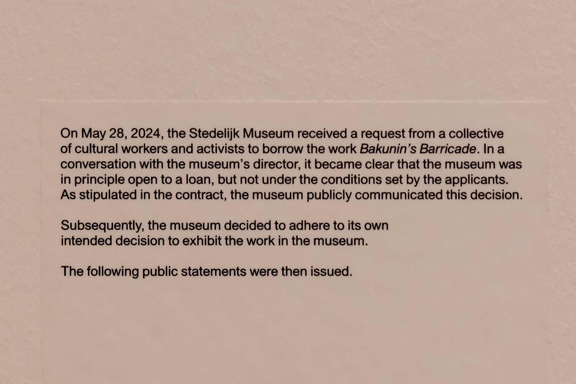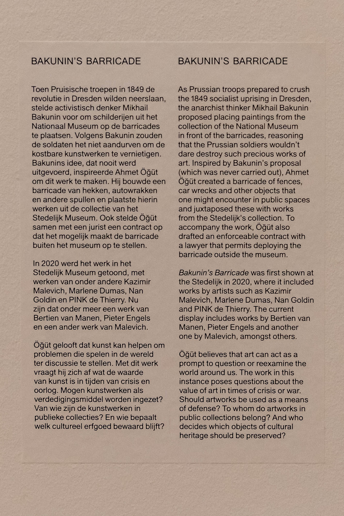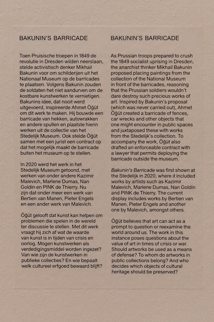 Ahmet Ogut has taken inspiration from this event and made his work, Bakunin’s Barricade, as part of an exhibition titled “In the Presence of Absence” in 2015. The Stedelijk Museum procured this artwork in 2020 and as part of the procurement, a contract was signed between the museum and Ogut, and in the contract, it was mandated that the installation should be permitted to be deployed outside the museum, should anyone ask for it. The installation is a barricade as one that would be made by protestors in the streets and in front of the barricade, are works from famous artists like Kazimir Malevich, Marlene Dumas, Nan Goldin, PINK de Thierry and others. Ogut has recreated Bakunin’s idea in this installation.