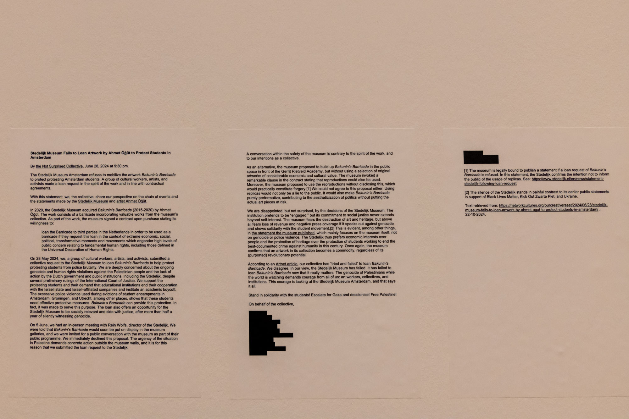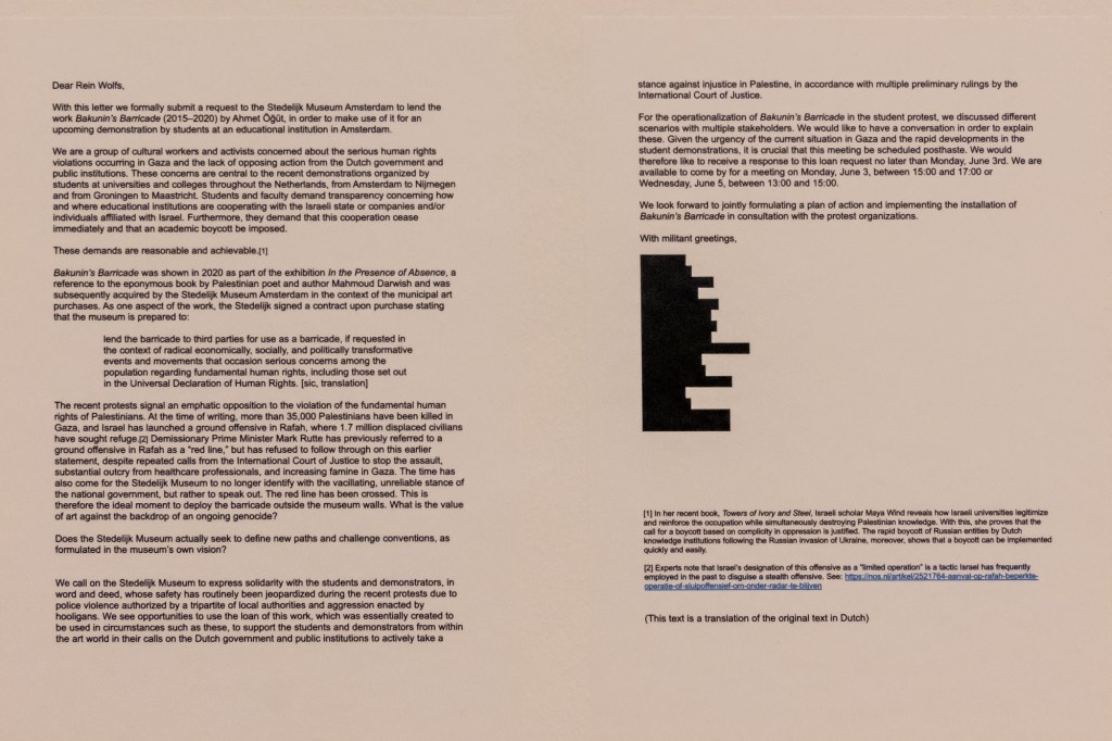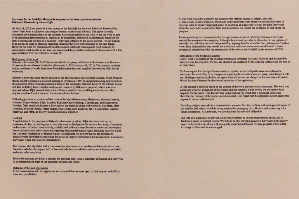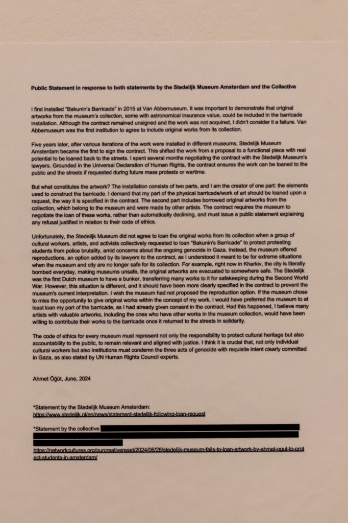 The protestors and Ahmet Ogut himself were not impressed; Marlene Dumas also was not convinced by the position taken by Stedelijk. The question that came up was why the museum had signed such a contract in the first place, if they had no intention of honouring it, especially when the request was made for an event to protest against the genocide in Palestine. Ogut contended that if the Museum did not want to lend artworks of others, they could have lent his work, just the Barricade. He felt that once other artists saw his Barricade being lent, they would have come forward and given their works as well. He condemned the position taken by Stedelijk and announced that he would not take part in any program nor oversee the installation of the Barricade elsewhere, till the museum changed its position. The group of activists didn’t mince their words and accused Stedelijk of preferring “economic interests over people”.