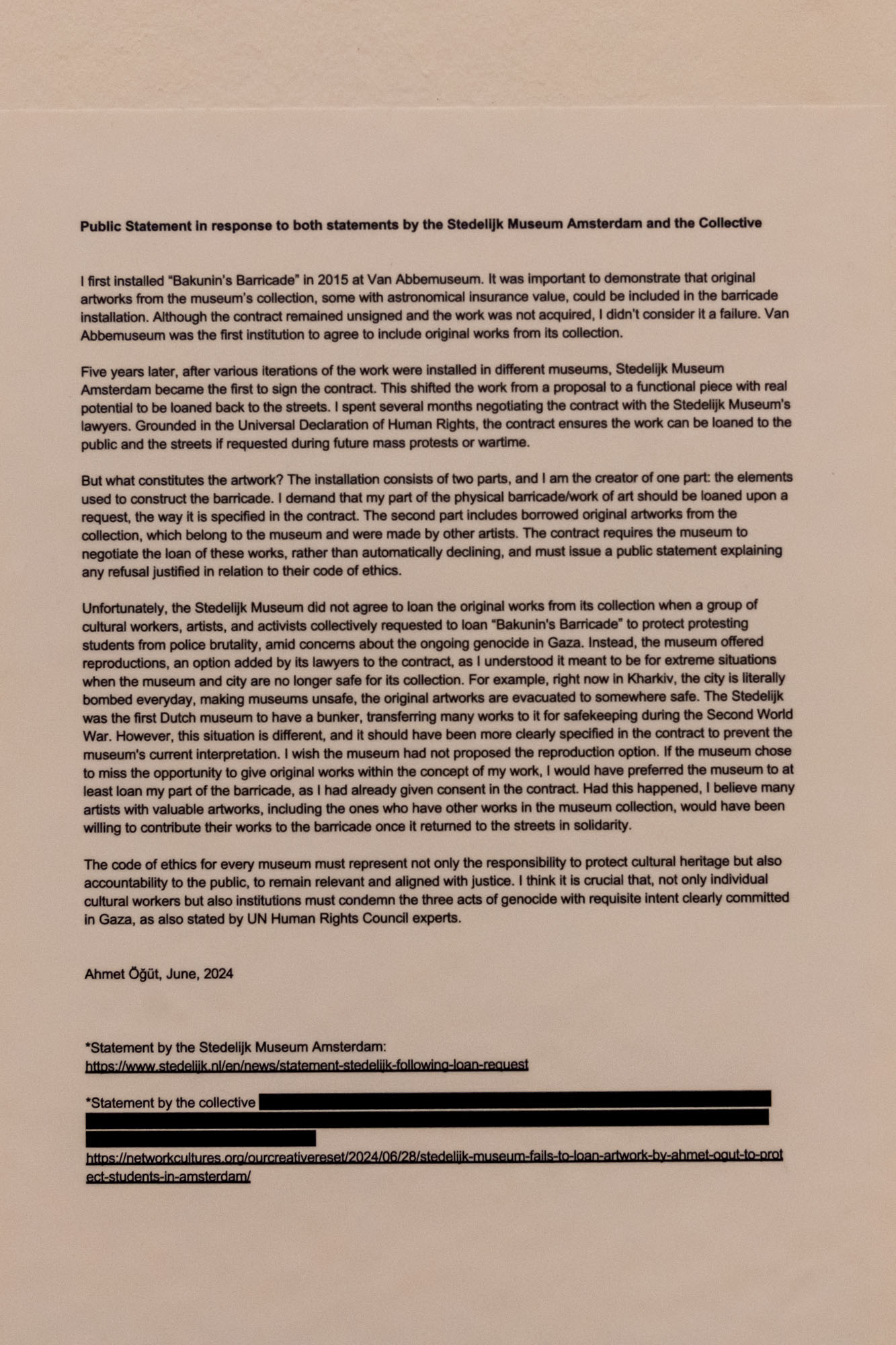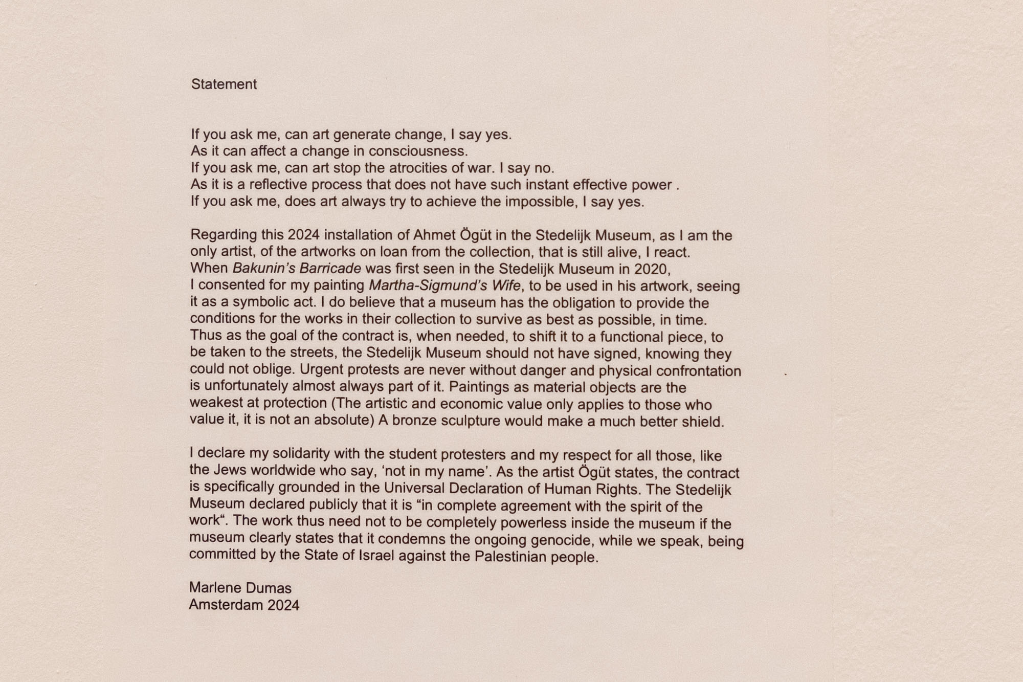 The museum authorities have now displayed all of this as part of the installation. The letters sent by the activists, the response by the museum, statements by Ahmet Ogut and Marlene Dumas are all displayed. In the audio commentary, the museum director asks a question to visitors on what they would have done, in this situation.