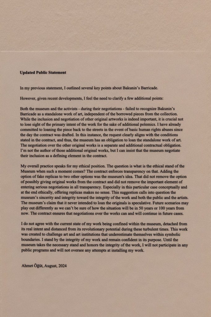 On 28 May 2024, a group of activists planning a protest against the human rights violations in Gaza, asked the museum to lend the artwork to them for using in a demonstration by students. They wanted Ogut’s artwork to play the role it was supposed to. The museum authorities were in a fix! They had signed a contract which specifically mandated that they should honour such requests, but it looks like they never expected anyone would actually make such a request. The contract also had a clause that the museum could decide, on a case-to-case basis, at their own discretion on whether a specific request was to be honoured or not. After mulling over the matter, they took a position that they could not take the risk of lending original artworks to be put on the barricade, as they might be damaged, but offered to provide replicas. Obviously, this was the same as refusing to lend the artworks as Bakunin’s whole premise was that government authorities would not destroy the barricades because the art works were original and thus precious. Nobody would have bothered about replicas. The museum authorities took the position that they had a responsibility to the people to protect original art works and could not jeopardise the safety of the art works by lending them to the protestors.