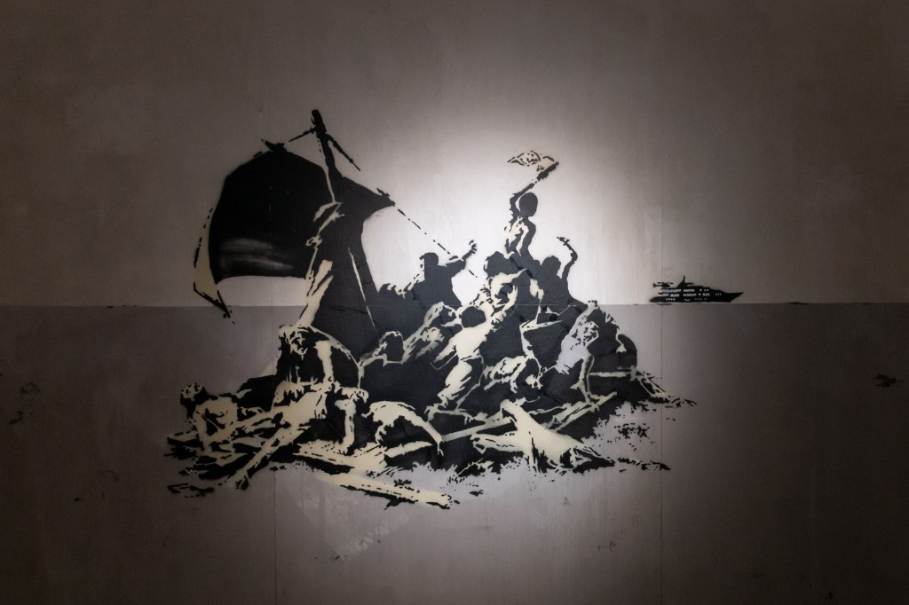 This is an artistic parody of Théodore Géricault’s “The Raft of the Medusa”. While Gerricault painted the plight of a bunch of shipwrecked soldiers, Banksy that projected that idea on to our times of the have and have-nots, with a luxury yacht thrown in.