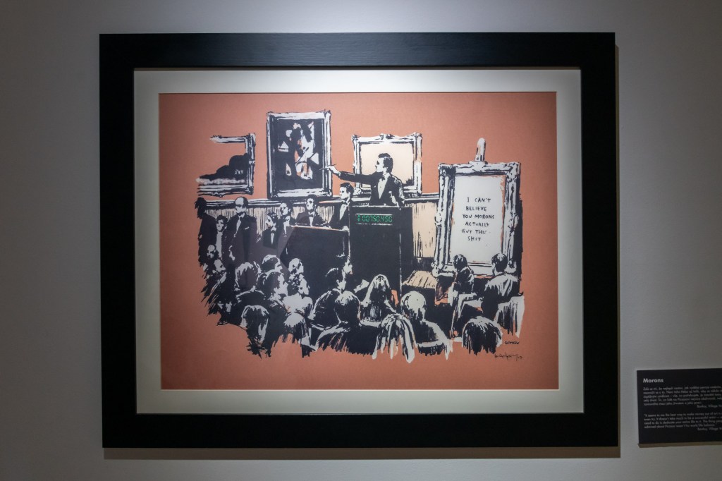 Here Banksy is seen mocking the art collectors who buy artworks at astronomically high prices. I was tempted to compare this work with what happened with the Girl with Balloon. I had read about the incident at the time and wondered whether the purchaser would agree to buy it now that the work itself was damaged. It just showed how little I understood the brains of the moneyed that operate in the art world. After the event, there were some negotiations, and the buyer agreed to pay the full price. Sotheby’s labelled the whole episode as “the first artwork in history to have been created live during an auction”. It sems market watchers had speculated then itself that the self-destruction would increase the value of the painting. Looks like they were right because the artwork appreciated in value from 1 Million to 18.5 Million in just three years; a return in investment that even the best investors can only dream about. So, they are not “morons” as Banksy states in his work. This ability to pivot and take on challenges and convert them into opportunities is a unique aspect of capitalism.
