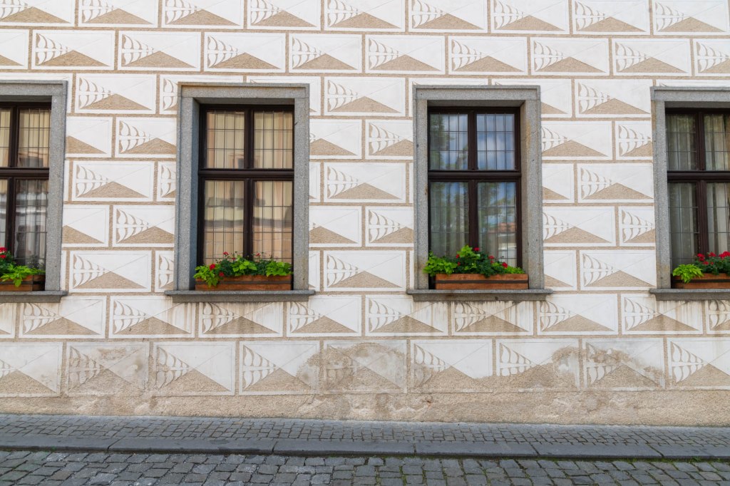 William was very influential, and he married four times but remained childless. For his third marriage to Anna Maria of Baden, he invited guests from all over Europe. They were so many that all could not be accommodated at the castle, big as it was. Hence, some houses nearby were used to accommodate some guests, and these houses were painted afresh. One such original fresco is surviving even now. During the Communist times, there was no attention paid to maintaining these heritage sites and often they were painted grey. You can see that some parts of the fresco have been damaged beyond repair.